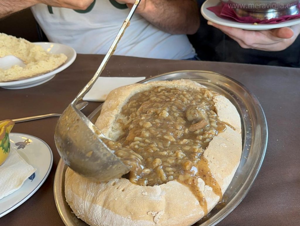 Todos los comensales comen directamente de la torta, que se va rellenando de gazpacho conforme se va terminando. Después, para aprovechar esta torta, se echa un poco de miel sobre ella a modo de postre. Por último, es típico tomar una bebida digestiva a base de tomillo y un poco de anís, ¡es toda una experiencia culinaria!