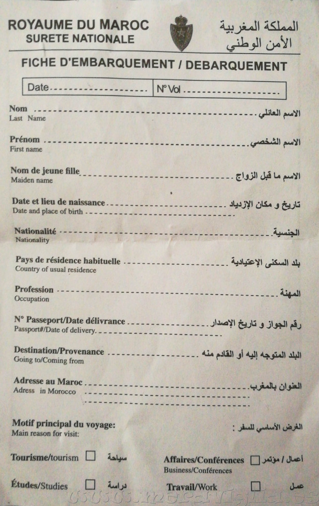 Como podéis observar, el documento está en árabe, francés e inglés. Yo dejé en blanco el ‘Nom de jeune flle‘ o Apellido de soltera, ya que en el caso de España esto no nos afecta. En cuanto a la dirección en Marruecos, me limité a poner el nombre del primer riad en el que nos alojábamos en Marrakech y no me pusieron ninguna pega. El N.º Vol. también lo dejé en blanco porque no tenía claro que tenía que poner (creo que es el n.º de vuelo) y no me dijeron nada.