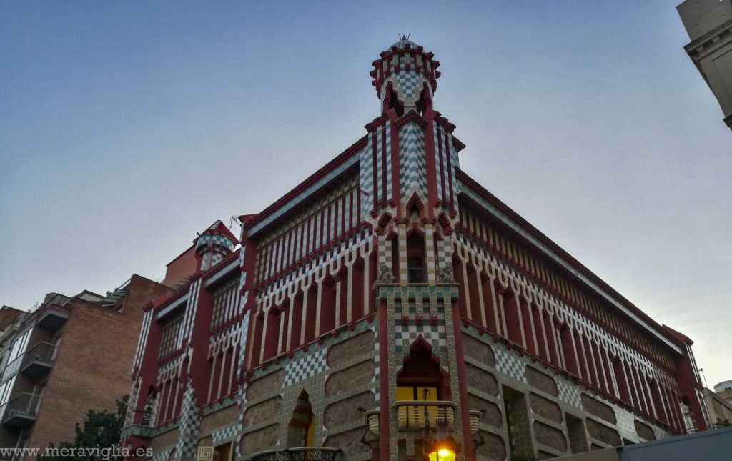 Después de la Casa Milà, entrando ya la noche, seguimos caminando por el barrio para ver por fuera otros edificios destacados de la zona, como son el Palacio del Barón de Quadras, la Casa de les Punxes y la Casa Vicens, que está algo más alejada, pero es realmente llamativa (fue una de las primeras obras de Gaudí).