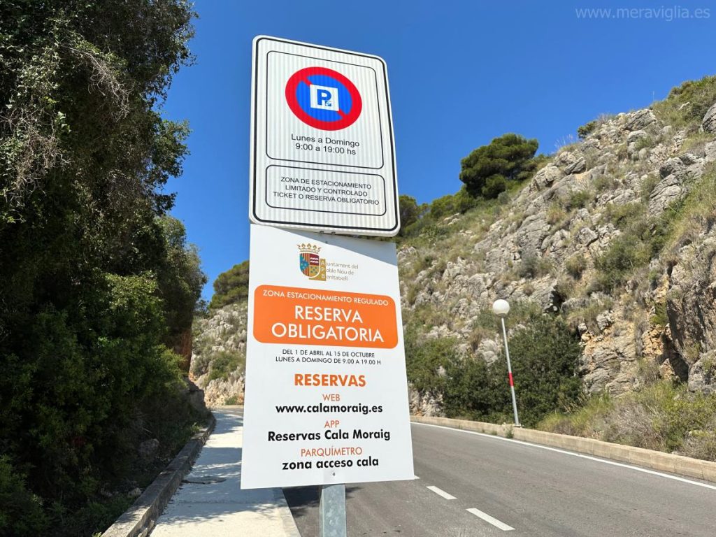 Desde este año, se ha habilitado un parking junto a la Cala del Moraig, teniendo un precio de 12 € por coche y día (sin importar el tiempo que pases aparcado, el horario es de 09:00 a 19:00). Según indican las señales del parking, está activo desde el 1 de abril hasta el 15 de octubre, y es obligatorio realizar una reserva online a través de esta web. No obstante, en el parking también hay una máquina en la que poder sacar el ticket.