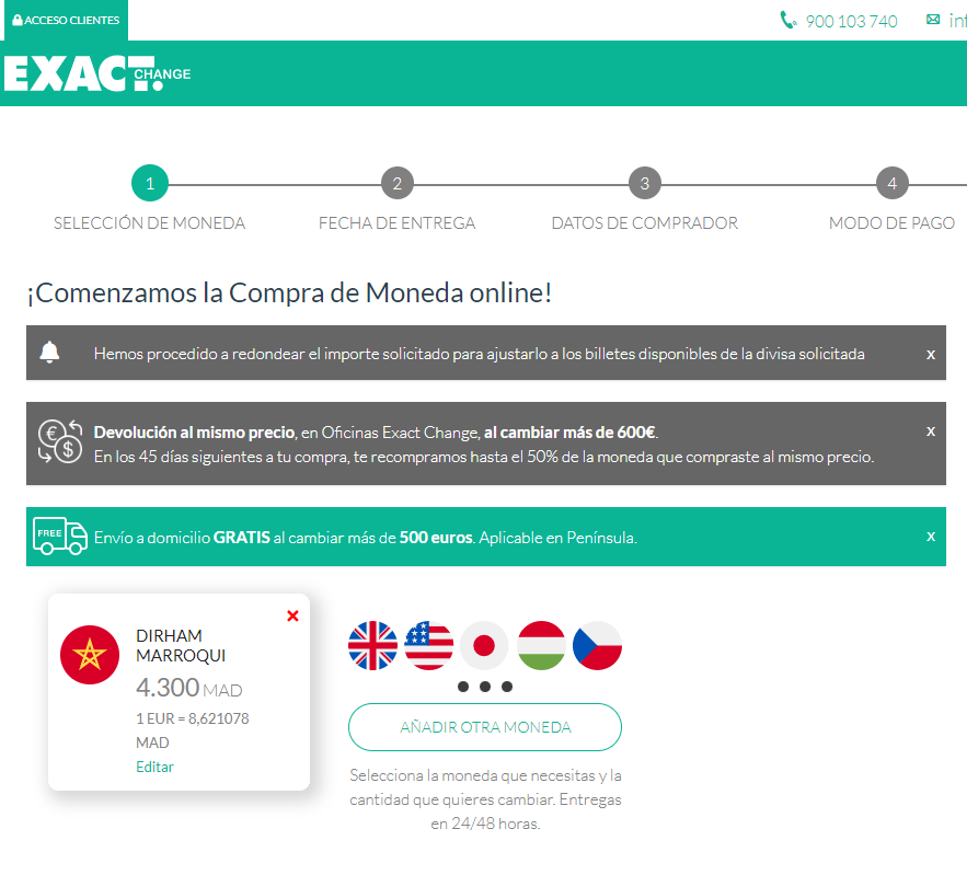 Una muy buena opción es Exact Change, una web que te permite pedir los dírhams por Internet y recibirlos en tu casa en 24/48 horas. Su tipo de cambio es muy bueno, tú mismo puedes comprobarlo en su web. Además, si pides un cambio de más de 500 € el envío es completamente gratis (y a partir de 600 €, podrás devolver el 50% del dinero al mismo tipo de cambio).