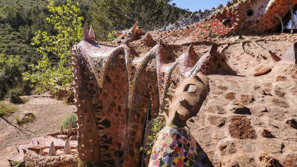 Centrándonos en la construcción en sí, es una especie de casa que tiene forma de dragón. La puerta es la boca; las ventanas, los ojos; el trencadís, las escamas… Todos los elementos constituyen un gran dragón que vigila la Sierra Calderona. Además, suelo y techo se confunden con sus curvas e incluso hay un pequeño tobogán en la zona superior. Sin duda, tiene un aire a los diseños de Antonio Gaudí, es un edificio que no deja indiferente a nadie.
