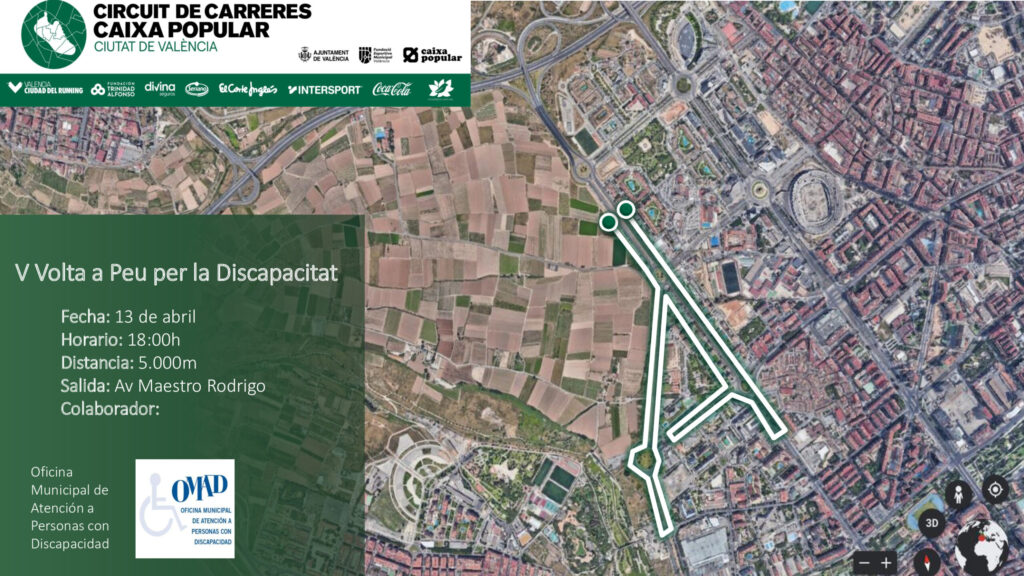 Esta es una de las carreras solidarias que se celebran en Valencia este 2024. Esta 5ª Volta a Peu per lla Discapacitat se celebra el 13 de abril a las 18:00. En ella se recorren 5 km. Otras dos carreras populares de esta primera en valencia son la IX Carrera José Antonio Redolat (el 12 de mayo) y la VI Carrera Marta Fernández de Castro (el 9 de junio). Ambas son también de 5 km.