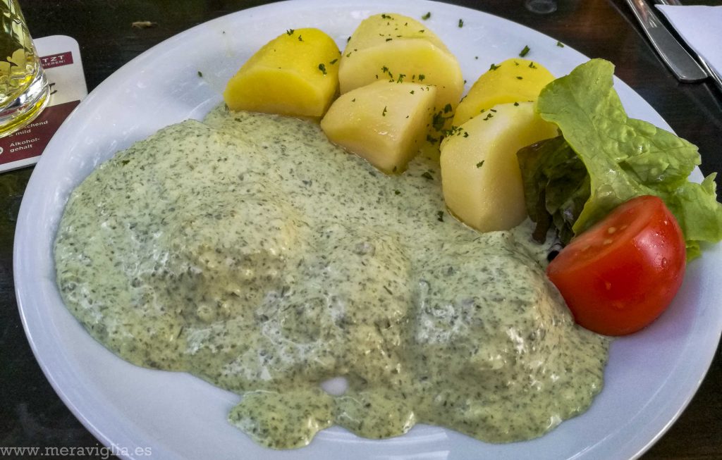 Sí, en Frankfurt tienen un salsa típica que podrás encontrar en varios tipos de plato. La salsa verde es el resultado de la combinación de siete hierbas y, aunque por el color no lo parezca, es una salsa bastante suave y nada pesada. Una de las formas en las que se suele servir es con huevo y patata cocida, las tres cosas mezcladas son una delicia, aunque también la podrás ver en algunos platos de carne.