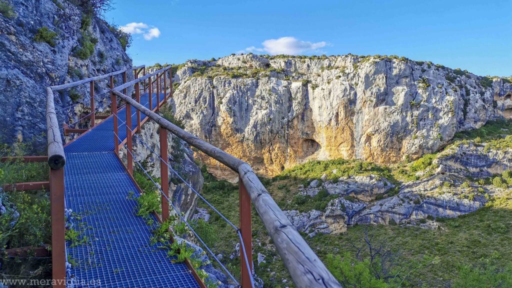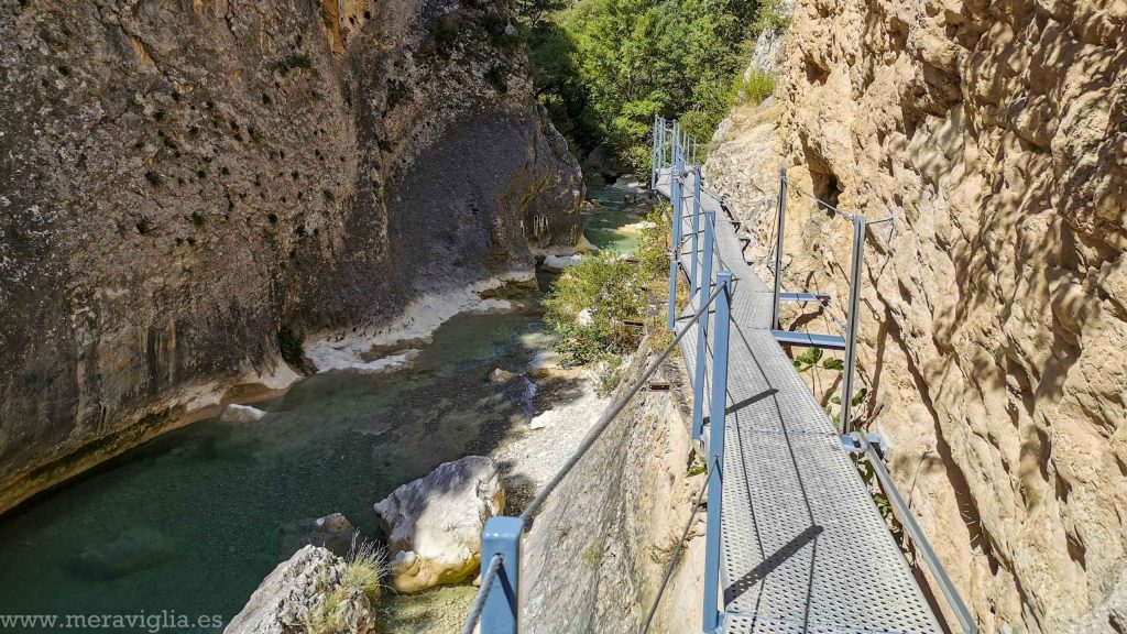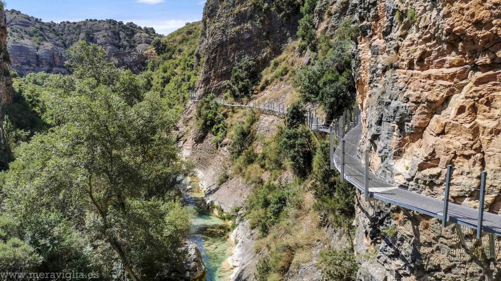 La ruta de las Pasarelas del Río Vero es un recorrido imprescindible que tienes que hacer si viajas a Alquézar. Consiste en una ruta que transcurre por el cañón del río Vero y, para atravesar algunas partes, hay que pasar por unas pasarelas de metal que quedan \’colgando\’ sobre el río. Recuerda bastante al famoso Caminito del Rey de Málaga, aunque aquí no se coge tanta altura, y las pasarelas al ser de metal dan más sensación de estabilidad.