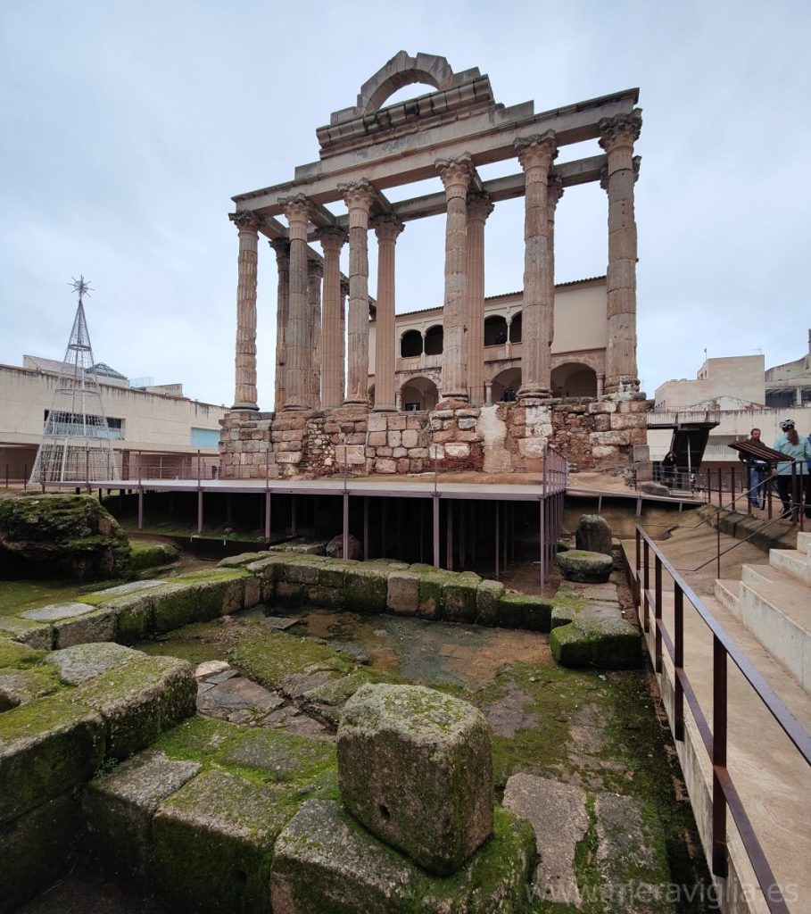 Volvemos hacia el centro de Mérida para llegar hasta el Templo de Diana. Data de los siglos I y II d.C. y estaba destinado al culto imperial, es decir, que en él se veneraba a los emperadores romanos. A partir del s. XVI, la estructura del templo se empleó para construir el Palacio de los Corbos. Tienes más información sobre este lugar en este artículo sobre el Templo de Diana de Arteviajero.