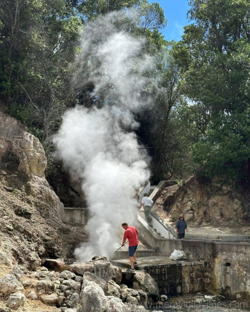 Las Caldeiras es el sitio que más me sorprendió de Furnas. Aquí es donde puedes comprobar que San Miguel es una isla «viva», con volcanes que están en estado latente. En las Caldeiras de Furnas hay pequeñas calderas volcánicas cuyo agua hierve por la temperatura que alcanza, así como fumarolas que desprenden un vapor cuyo olor nos recordó al del huevo podrido.