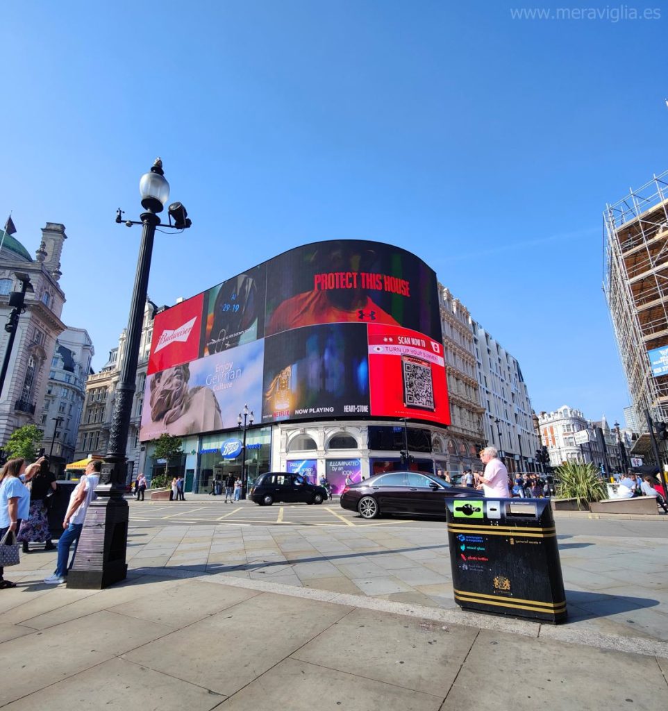 Si por algo es famoso Piccadilly Circus es por sus grandes pantallas en las que aparecen anuncios de distintas marcas. Oficialmente, se llaman Piccadilly Lights y a día de hoy tienen unas dimensiones de 783.5 m2, por lo que son las pantallas publicitarias más grandes de Europa.