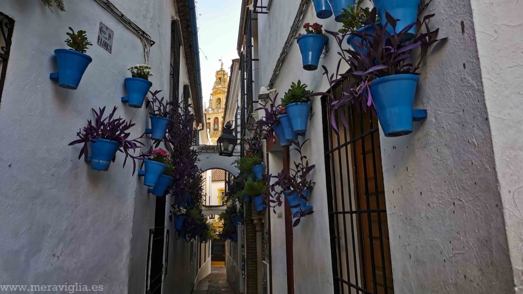 Una vez llegamos, dejamos las cosas en el hotel y descansamos un poco, comenzamos dando un paseo por la judería, un barrio con mucho encanto. Aquí es una parada obligatoria la Calleja de las Flores. Entra a ella y da media vuelta para ver unas bonitas vistas de la torre de la Mezquita-Catedral ente las macetas con flores de la calle.