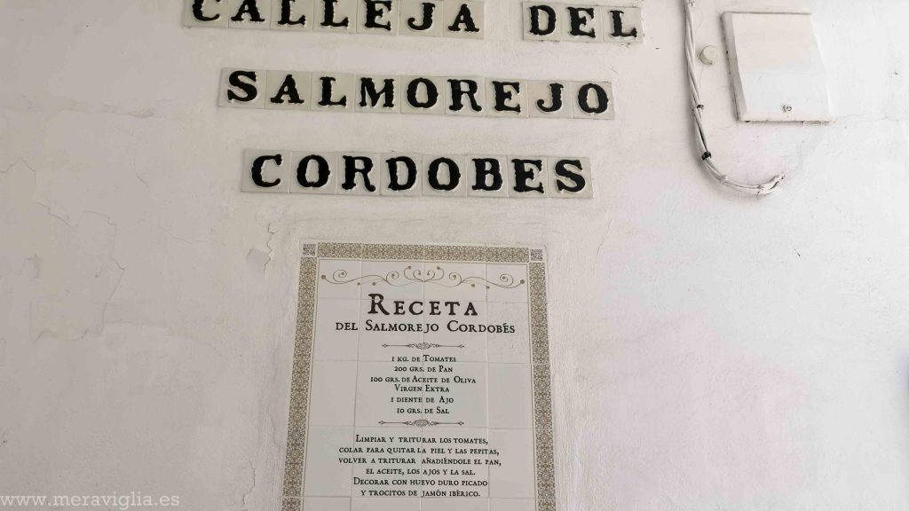 Para despedirnos, comimos tranquilamente, degustando otros de los platos típicos cordobeses, como el flamenquín. Volviendo hacia el hotel, nos encontramos con la Calleja del Salmorejo Cordobés, que además de muy bonita, resulta curiosa porque tiene en su pared escrita la receta original del salmorejo.