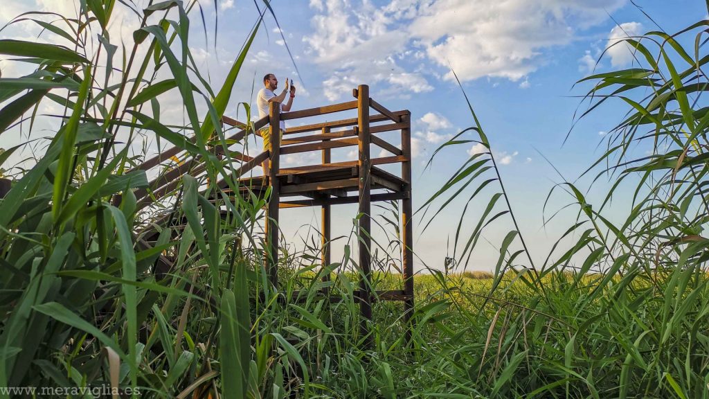 A lo largo del camino te encontrarás con miradores de madera. Te recomiendo que subas a ellos, ya que desde arriba es desde donde apreciarás bien el tamaño del humedal y podrás divisar algunas de las aves que viven en él, como los flamencos. Si tienes prismáticos o una cámara con un buen zoom, traétela contigo.