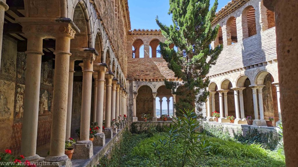 Una de las partes más bonitas de la colegiata es su claustro. Además, es único en todo Aragón, y por eso está en esta lista de lugares curiosos de Huesca, ya que es el único claustro de Aragón que cuenta con frescos pintados en sus paredes. Además, en uno de sus capiteles, también hay esculpida una figura difícil de encontrar en otros sitios: una persona con tres cabezas que simboliza a la Santísima Trinidad.