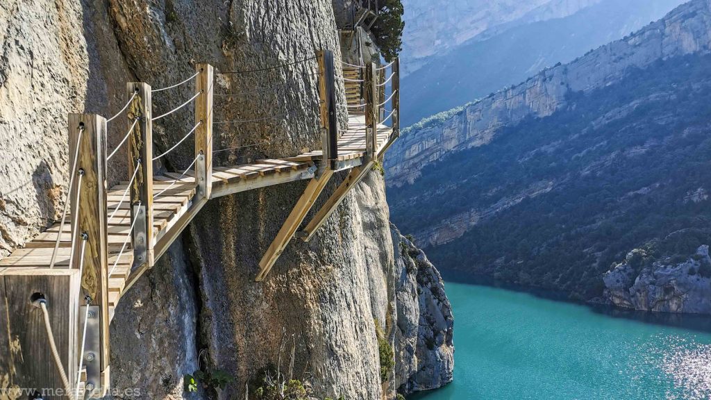 Además, si se hace la ruta lineal completa, una vez atravesado el puente colgante, ya no estarás en Huesca, sino en Lleida, ya que aquí se encuentra la frontera natural entre Aragón y Cataluña, y podrás recorrer el Congost de Montrebei, un camino excavado en la montaña.