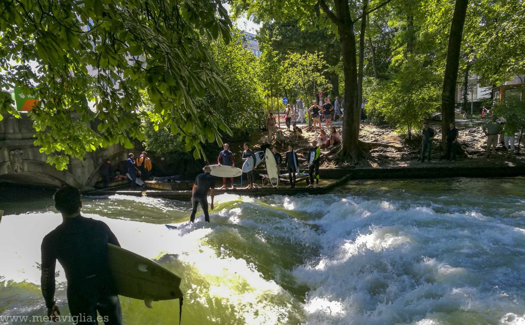 La Eisbachwelle u ola del Eisbach está dentro del Jardín Inglés de Múnich, uno de los jardines urbanos más grandes del mundo. Por él pasa el Eisbach, un pequeño río artificial que parte del río Isar. Este riachuelo tiene una longitud de 2 km y en los días de calor puedes ver a gente incluso bañándose en él.