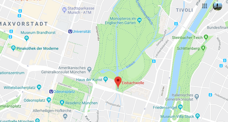 La ola tan característica que se puede surfear se ubica cerca del Haus der Kunst, un gran museo de arte contemporáneo, justo al lado de un pequeño puente. La forma más rápida de llegar es por la calle Prinzregentenstraße. Como podéis ver en la siguiente imagen, incluso aparece reflejado en Google Maps, por lo que se puede llegar sin problema.