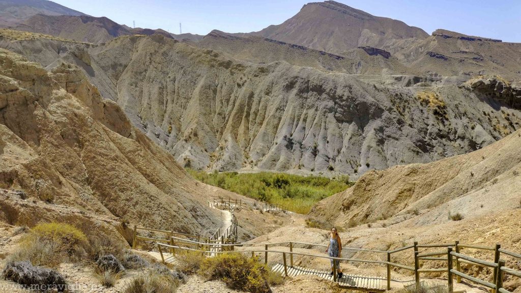 Después dejamos el coche en las inmediaciones del Oasis Minihollywood y caminamos a la derecha del parque para tener unas vistas del desierto que bien recuerdan a las de las películas del oeste. El punto que visitamos lo puedes encontrar en Google Maps como \’escalera ruta el Cautivo\’. De aquí parten varias rutas de senderismo que tenían buena pinta, pero siendo agosto y las 12 del medio día, no fue una opción para nosotros.
