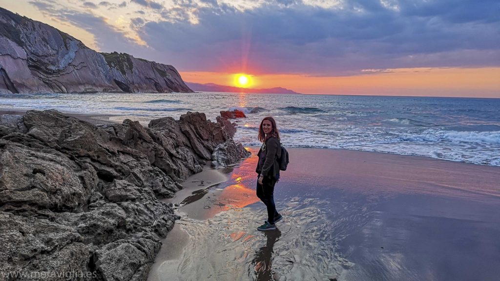 Comienza a caer el sol, llega uno de los momentos más mágicos del día: el atardecer. Vuelvo bastante cerca de casa, ya que aparezco en la Playa Itzurun de Zumaia (País Vasco). Me siento a observar sus grandes flysch de millones de años y a dejarme embaucar por las tonalidades moradas y rosáceas del cielo, mientras el sonido de las olas me ayuda a parar un poco.
